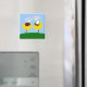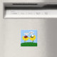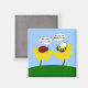 Sur ce mignon aimant, une bourde agacée est assise sur une fleur jaune et demande : "Pourquoi m'embêtez-vous, dame ?" à laquelle répond le coccinelle assis sur une autre fleur, "Bee-parce que vous êtes mignonne". D'après mon image numériquement originale.