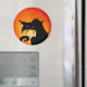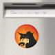 Scary chat noir avec les yeux orange devant une grande lune orange, pleine.