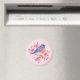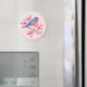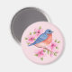 Aimant rond avec un joli bleu. Ceci est reproduit à partir de ma peinture numérique d'un bleu sur une branche avec des fleurs roses et un arrière - plan rose clair.