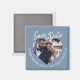 Magnét de faire-part de mariage à l'écriture moderne en bleu poussiéreux avec une fenêtre photo en forme de cœur, un fond bleu clair et un titre en lettrage manuscrit blanc. Ce design met magnifiquement en valeur votre photo de fiançailles tout en présentant clairement la date et le lieu du mariage dans une palette de couleurs cool et raffinée. Parfait pour les mariages, les célébrations de destination, les renouvellements de vœux ou les fiançailles élégantes avec une esthétique moderne ou classique. Personnalisez facilement avec vos détails.