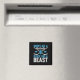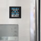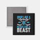 Aimant de gardien de hockey avec texte bleu et blanc, casque avec masque, rondelles et bâtons de hockey dit Drop Like a Butterfly Block Like a Beast!