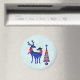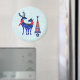 Un aimant avec un arrière - plan vert clair et blanc enneigé. Illustré par une paire de cerfs bleus scandinaves portant des foulards rouges. Avec des marquages décoratifs sur le corps. Un sapin de Noël de style nordique en bleu et rouge avec une étoile au sommet, se dresse à côté du renne.
