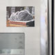 This napping cat ceramic tile features the original artwork, "The Bookmark" depicting a gray cat sleeping on an old book in a dark bookstore or library. This cat themed tile is available in two different sizes and can be used as a trivet or a great accent tile perfect for cat lovers! Artwork Copyright: Dominic A. White.