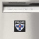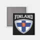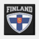 Le drapeau national de Finlande est infusé dans une forme de bouclier qui a des contours bleus et blancs dans les couleurs du drapeau. Le nom du pays est ajouté au-dessus de l'image.