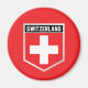Le drapeau national de la Suisse est infusé dans une forme de bouclier qui a également le nom du pays placé au-dessus du drapeau.