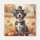 Un tableau aquarelle d'un chien gai assis au milieu d'un tas de feuilles d'automne vibrantes, entouré de minuscules citrouilles et de glands épars. Le chien porte un petit casquette pèlerin et des poutres de joie, capturant l'esprit de Thanksgiving. Dans l'arrière - plan, les champs de moissons et les arbres dorés créent une ambiance campagnarde paisible. Des textures douces et des tons d'automne chauds et feutrés confèrent à la scène une atmosphère cosy et nostalgique parfaite pour célébrer la beauté de la saison.