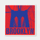 Vue rapprochée du pont Brooklyn entre les câbles électriques. Les câbles forment une toile d'araignée artificielle avec l'imposante tour en pierre du pont dans l'arrière - plan. Le mot Brooklyn dans le texte en bloc est affiché en bas avec un arrière - plan de couleur solide. Disponible en plusieurs variantes de couleurs.