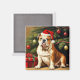 Un bulldog anglais portant son chapeau de Père Noël, posant près du sapin décoré.