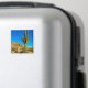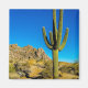La photographie présente un grand cactus saguaro multi-armé par un sentier randonnée qui mène vers une montagne de rochers jonchée dans le désert de Sonoran.