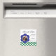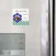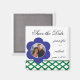 Ce design amusant et moderne est un rappel d'aimant Save the Date parfait. L'arrière - plan est blanc avec une fleur bleue comme cadre pour votre photo. Il y a un graphique de clôture en treillis vert en bas. Le texte est entièrement personnalisable.