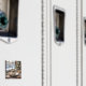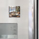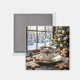 Un joli aimant saisonnier de Noël avec une image chaleureuse et cosy d'une tasse de café chaud, pain d'épices biscuits hommes assis devant une fenêtre donnant sur une jolie scène hivernale.