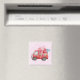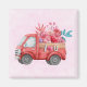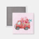 Un aimant avec un joli camion d'aquarelle rouge. Portant des coeurs et des fleurs à l'arrière. Je t'aime, écrit sur le côté. Whimsical et adorable. Arrière - plan à motif rose clair.