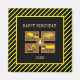 Ce design comprend quatre camions de construction classiques en jaune gras disposés ensemble sur un arrière - plan marron et noir. Il comprend d'autres éléments de construction comme des rails de garde et des cônes de circulation et des bandes de trafic noir et jaune. Nous vous avons couvert pour une soirée à thème camions de construction : fournitures, déco, délicieuses friandises et cadeaux personnalisés significatifs!