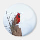 Un cardinal rouge du nord perché sur une vieille clôture décorant un aimant. Le design fonctionne bien sur plusieurs tailles. Le texte peut être ajouté pour le rendre personnalisé. tons cool avec aiguilles de pin autour du cardinal.