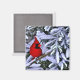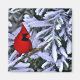 Un beau cardinal rouge se reposant parmi les verdures d'hiver enneigées.