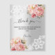Un arrière - plan faux argenté. Décoré de roses roses roses, de fleurs et de dentelle blanche. Script écrit à grande main avec des swashes et le texte : Merci. Personnalisez et ajoutez la note de remerciement et le nom.