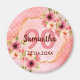 Un aimant tendance et girly pour une fête d'anniversaire de 90 ans. Avec un faux cadre géométrique hexagonal doré. Décoré de fleurs de dahlia aquarellées en rose, crème et corail. Fond couleur corail vivant avec des pois. Modèles pour un nom, âge 90 et une date. Date de naissance ou date de la fête. Lettres de couleur bordeaux et corail. Parfait comme faveur, souvenir ou rappel pour vos invités.