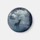 Aimant avec une photo d'un cerf royal aux bois de bois debout dans une forêt ombragée au milieu d'arbres éclairés par le soleil. Neige tombant tout autour.