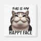 C'est mon Happy Face, sérieusement heureux. Cette image présente un portrait en gros plan d'un chat avec un large et heureux sourire. Le chat regarde le spectateur avec ses grands yeux ronds, et ses murmures sont visibles. La fourrure du chat est un mélange de noir, blanc et gris. Le visage heureux du chat est mis en évidence par le texte "C'est mon visage heureux" écrit en caractères gras et noirs au-dessus et au-dessous de la tête du chat. L'image transmet un sentiment de joie et de contentement, et elle est sûre d'apporter un sourire au visage de quiconque.