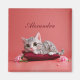 Un mignon chat tabby en caricature gris et blanc pond sur un coussin couleur grenat avec oeillets roses à proximité.