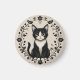 Illustration d'un chat noir et blanc centré dans un motif floral décoratif sur fond beige, évoquant un sentiment d'élégance et de charme. Idéal pour les conceptions artistiques et créatives.