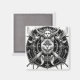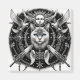 L'image est une illustration détaillée et mystique centrée autour du visage d'un chat aux yeux bleus saisissants. Le visage du chat est entouré d'éléments symboliques complexes qui lui donnent une aura de puissance et de sagesse. Au-dessus de la tête du chat se trouve un soleil radieux avec un visage humain, ajoutant une qualité céleste et divine à la scène. De chaque côté du chat se trouvent deux colombes en vol, qui représentent la paix et la pureté. Toute la composition est encadrée par des éléments circulaires, mécaniques et célestes, tels que des engrenages, des chaînes et des étoiles, évoquant un sens de l'équilibre cosmique et du mystère. Deux épées ornées se croisent sous le visage du chat, symbolisant la protection et la force. Ces épées sont ornées d'éléments décoratifs et sont complétées par des ailes, renforçant ainsi le thème mystique de l'image. Le style général de l'image est monochromatique, avec des détails fins et un mélange de motifs organiques et géométriques qui créent un sentiment d'harmonie et de puissance. La combinaison de ces éléments suggère des thèmes de la tutelle, de la perspicacité spirituelle et de l'ordre cosmique, avec le chat servant de figure centrale, presque divine, dans ce tableau complexe, autrement mondain.