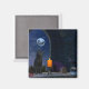Un mignon chat noir est assis sur une table en regardant une bougie éclairée. Sur la table se trouvent également un livre, un gobelet, une bouteille, un coffre, un casquette et une boule de cristal avec un corbeau assis sur le dessus. Une pleine lune brille dans la fenêtre sur la scène.