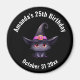 Anniversaire enregistrez la date / keepsaké aimant avec une amusante illustration thématique Halloween pour les amoureux de les chats. Un gros chat noir aux yeux vêtu d'un grand casquette de sorcière noire avec une ceinture rose violet autour du bord.