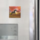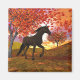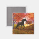 Un aimant avec mon oeuvre d'ordinateur d'une scène d'automne venteuse avec des feuilles d'érable orangé soufflant autour d'un cheval galopant à travers les arbres.