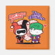 Découvrez Chibi Joker présentant Chibi Harley Quinn avec une carte de jeu de coeur, avec leurs noms écrits au-dessus d'un coeur de pois géant dans l'arrière - plan.
