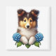 Une oeuvre d'art étonnante d'un mignon chiot en collie entouré de fleurs bleues vives sur fond sombre, évoquant la chaleur et la tendresse.