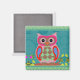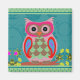 Chouette à patchwork de pois mignon multicolores, se tenait sur une branche d'arbre fleurie avec un arrière - plan bleu orné et des bordures de pois verts.