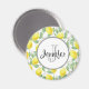 Un aimant personnalisé avec un nom et un monogramme initial sur un cercle blanc avec une bordure de corde. Conçu avec des citrons jaunes et des feuilles verts, dans un motif extensible.