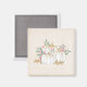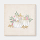 Un aimant avec de belles citrouilles blanches aquarelles avec des accents de paillettes dorées fausses. Entouré de feuilles vertes et de fleurs sauvages roses.