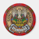 Clan Drummond crête badge entouré d'une sangle et boucle sur l'arrière - plan tartan. Texte personnalisé.
