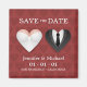 Annoncez votre mariage de façon originale et informelle avec cette annonce amusante Enregistrer la date avec aimant de maintien en forme de coeur marié et marié, mariage couple illustration sur rouge. Personnalisez cet aimant avec votre propre texte ou customisez-le davantage si vous souhaitez ajuster la disposition ou modifier le texte et la couleur arrière - plan. Design également disponible sur Enregistrer les cartes de date, les invitations et les timbres correspondants.