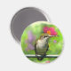 Cet aimant présente un jeune colibri à gorge rubis qui n'a pas encore développé la coloration rubis sur sa gorge. Il est assis sur un bar en métal, prêt à plonger dans le nectar des fleurs qui l'entourent. L'arrière - plan est une palette douce et agréable de rose, rouge, or, jaune et vert.