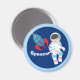 Un cadeau d'aimant spatial cool pour un enfant qui aime les planètes et les vaisseaux spatiaux. Comprend un astronaute dans un ensemble spatial rouge et bleu flottant dans le ciel à côté d'un navire-fusée. Customisez avec le nom de votre enfant en blanc sur l'arrière - plan bleu profond et utilisez-le pour accrocher leur art sur le réfrigérateur.