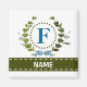 Une couronne de lierre délicate avec un ruban rayé bleu est superposée sur un fond blanc frais. La conception appropriée pour un mariage présente le monogramme "F" en bleu. L'aimant peut être personnalisé avec n'importe quel nom sur la bannière de ruban vert. Astuce de conception : pour la police présentée ici, utilisez des majuscules pour le nom.