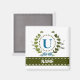 Une délicate couronne de lierre avec un ruban rayé bleu est superposée sur un fond blanc frais. La conception appropriée pour un mariage comporte le monogramme "U" en bleu. L'aimant peut être personnalisé avec n'importe quel nom sur la bannière de ruban vert. Conseil de conception : pour la police affichée ici, utilisez des majuscules pour le nom.