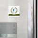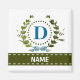 Une couronne de lierre délicate avec un ruban rayé bleu est superposée sur un fond blanc frais. La conception appropriée pour un mariage comporte le monogramme "D" en bleu. L'aimant peut être personnalisé avec n'importe quel nom sur la bannière de ruban vert. Astuce de conception : Pour la police affichée ici, utilisez des majuscules pour le nom.