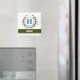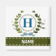 Une couronne de lierre délicate avec un ruban rayé bleu est superposée sur un fond blanc frais. La conception appropriée pour un mariage comporte le monogramme "H" en bleu. L'aimant peut être personnalisé avec n'importe quel nom sur la bannière de ruban vert. Astuce de conception : pour la police présentée ici, utilisez des majuscules pour le nom.