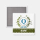 Une couronne de lierre délicate avec un ruban rayé bleu est superposée sur un fond blanc frais. La conception appropriée pour un mariage présente le monogramme "Q" en bleu. L'aimant peut être personnalisé avec n'importe quel nom sur la bannière de ruban vert. Conseil de conception : Pour la police présentée ici, utilisez des majuscules pour le nom.