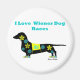 J'adore les courses de chiens plus vierges en texte turquoise gras au-dessus de l'illustration graphique d'un dachshund noir blanc recouvert de fleurs peintes, avec son numéro de course sur le dos et ses chaussures de tennis sur. Un cadeau adorable pour tout amateur de doxie.