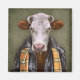 This design objets a portrait of a cow in a leather jacket and scarf.