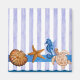 Aquarelle originale peinte par Sandra Gale, avec des étoiles de mer, des chevaux, des tortues et des coquilles sur un arrière - plan de bandes bleues translucides verticales. Conception idéale pour l'été, les maisons de plage, les bungalows ou pour tous ceux qui aiment la plage, l'océan ou le poisson.