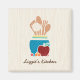 Ajoutez une touche d'hospitalité à votre cuisine avec ce mignon aimant de style champêtre avec un ensemble de cuillères en bois dessiné à la main et des ustensiles de cuisine dans une marmite turquoise entourée d'une délicieuse pomme rouge et de fruits frais. Ce design à thème de cuisine de campagne est doté d'un arrière - plan motif en bois clair.