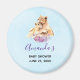 Un aimant baby shower avec une jolie aquarelle peignant un lion-mère tenant son bébé. Un joli bouquet fleuri violet en dessous ajoute une touche douce à cette image douce et adorable. Arrière - plan bleu clair.