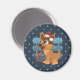 A round magnet with illustration of cute German Shepherd with a present on a starry night dark blue background, illustrated by Radka2D