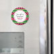 Aimant d'anniversaire avec un mignon motif de pastèque. Croûte verte en couches de rayures avec une couche de rayures roses avec des graines noires à l'intérieur. Amusement et design estival. Un cercle superposé avec un texte personnalisé à l'intérieur.